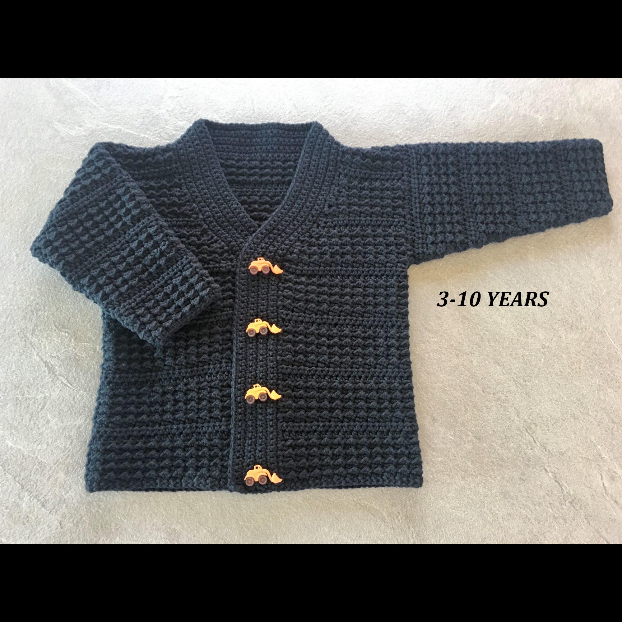 Create a stylish and cozy handmade sweater for toddlers and children with this beautifully textured v-neck crochet cardigan. Designed for a seamless finish, it is worked in one piece from the bottom up, eliminating the need for side seam sewing. Perfect for both boys and girls, this versatile design is a must-have for any handmade wardrobe. The Aaron Crochet Cardigan Sweater by Lisa’s Crochet Designz is available in four sizes (3-10 years), with the matching Aaron Hat available separately (see last photo) for a coordinated look.