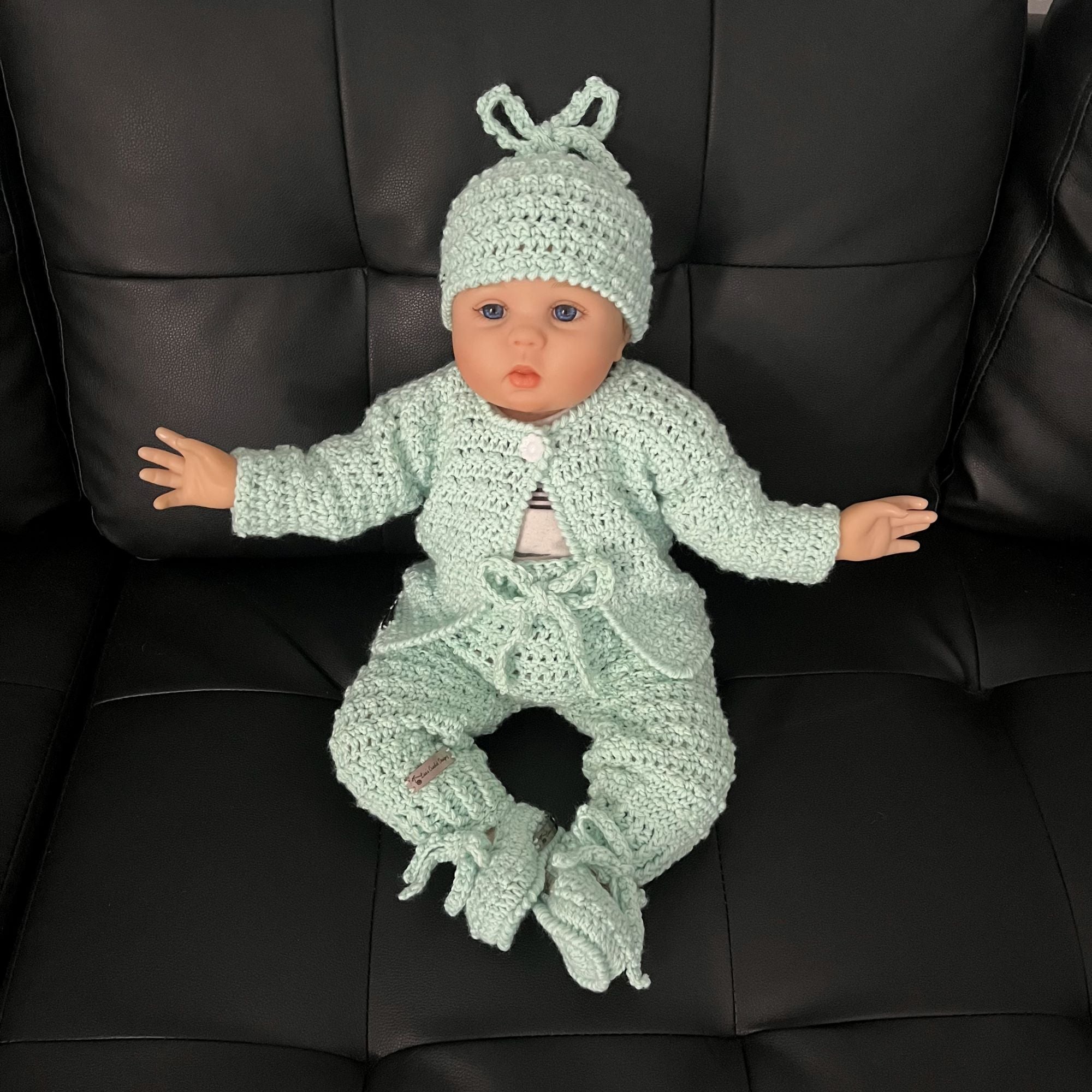 Create a beautifully coordinated handmade baby outfit with the Fiona Crochet Pattern Collection. This matching five-piece set includes a cardigan, hat, booties, baby pants, and a trendy bandana bib — all designed to work together for a polished, comfortable finish. Featuring textured stitch details and timeless styling, this versatile collection is perfect for everyday wear, baby showers, and thoughtful handmade gifts.