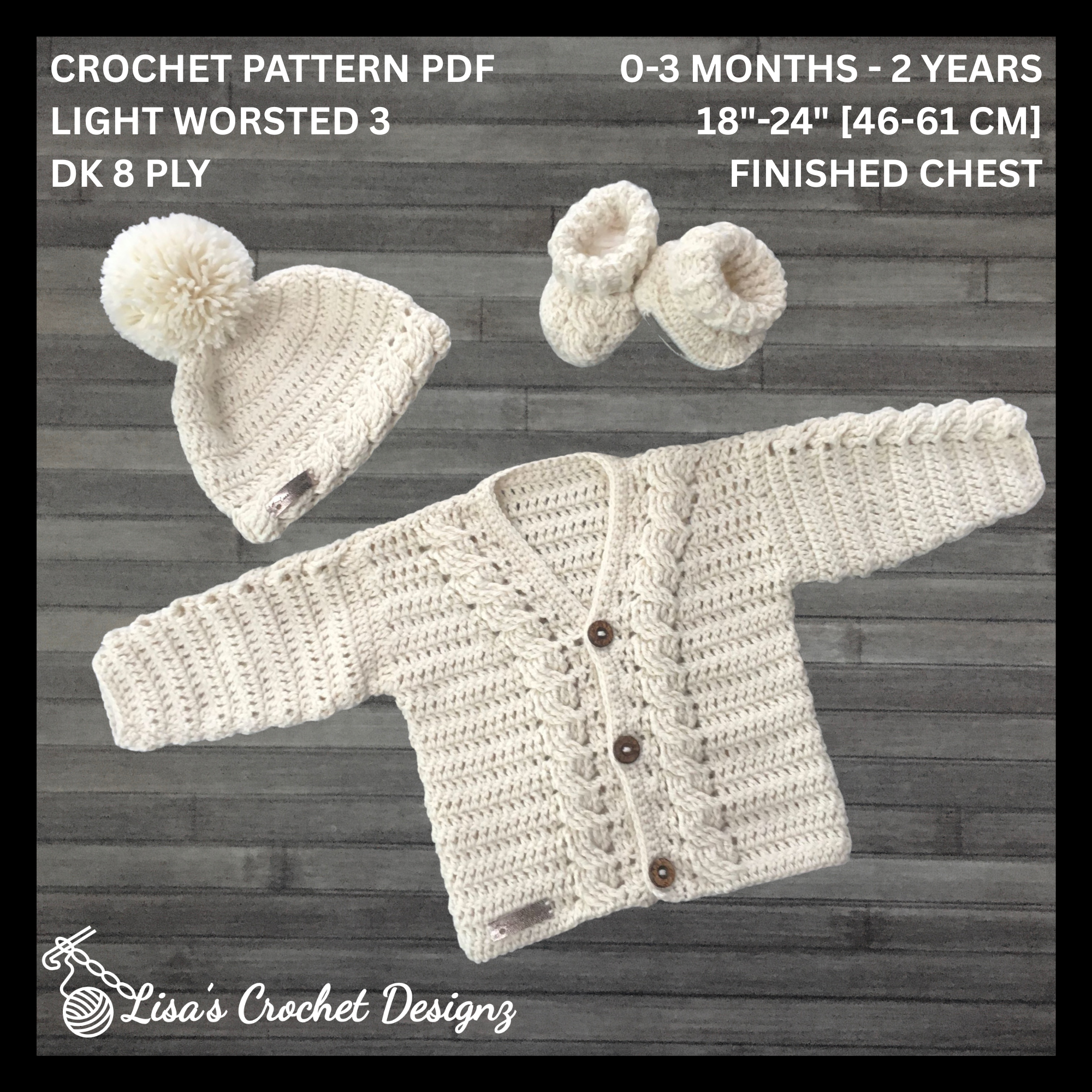 Wrap your little one in warmth and style with this adorable crochet baby sweater, hat, and booties set featuring delicate cabled details. Designed for a seamless finish, each garment is worked in one piece from the bottom up, eliminating the need for sewing. Perfect for both baby boys and girls, this unisex design is available in four sizes (0-24 months). The Cooper Cardigan Hat and Booties by Lisa’s Crochet Designz pairs beautifully with the matching Cooper baby pants pattern, available separately - see last photo 🛒