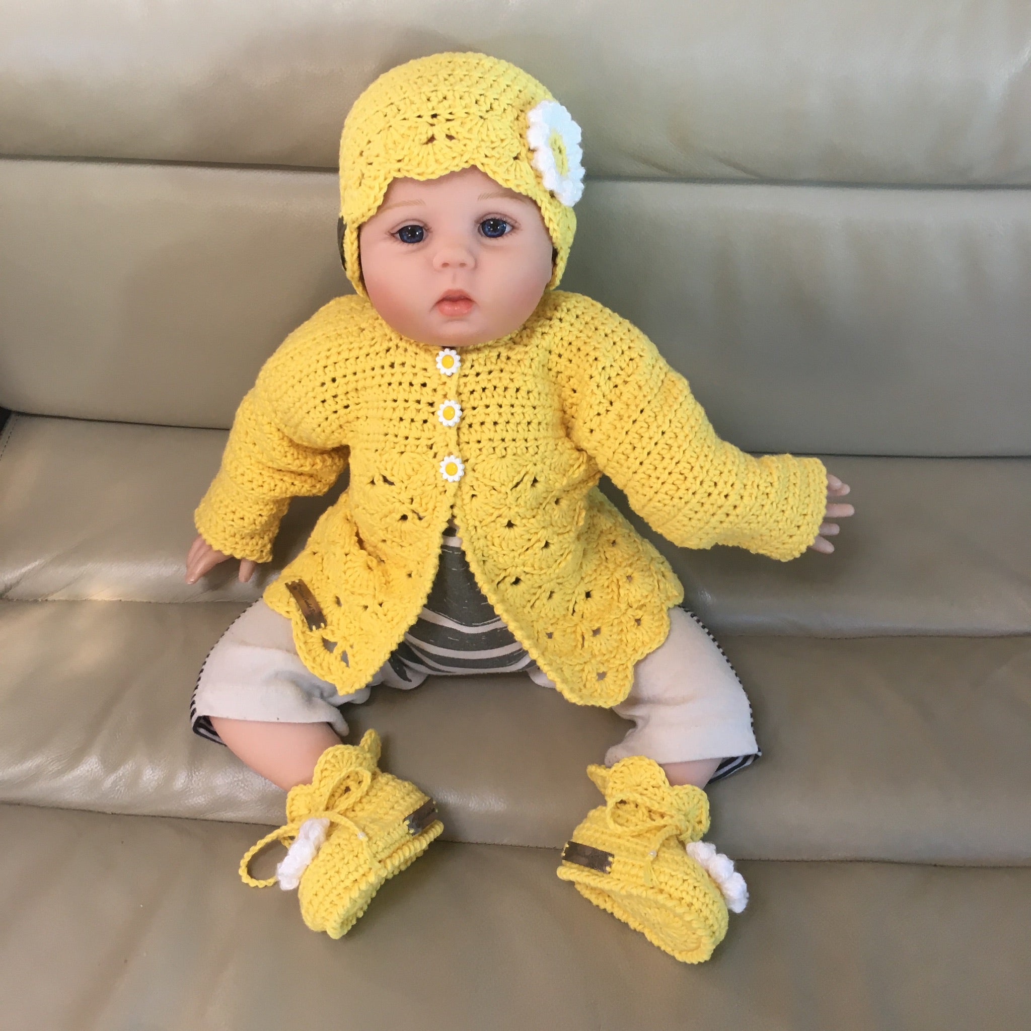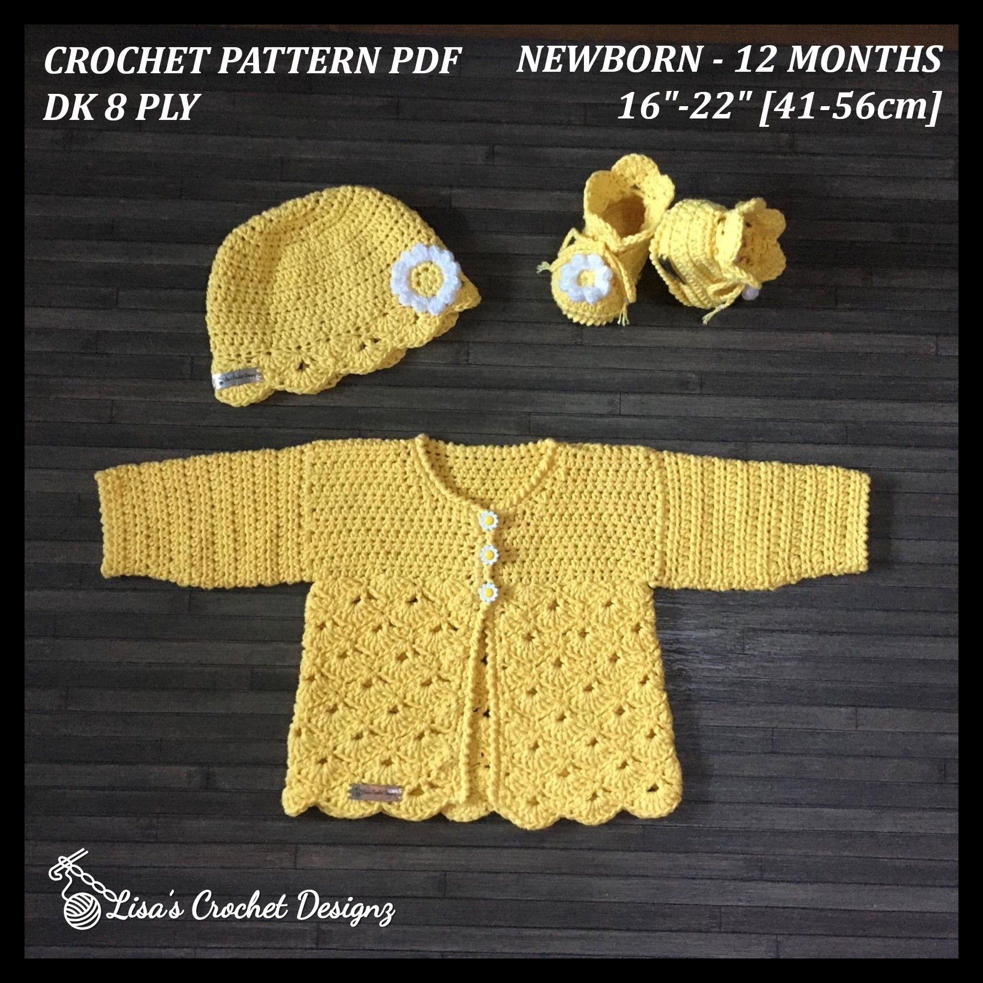 A delicate and lacy crochet set perfect for baby girls, featuring a seamless cardigan, a cozy hat, and adorable booties, Newborn to 1 Year. The sweater is crafted in one piece from the armhole up and then down, eliminating side seams for a neat finish. The hat is worked in the round from the top down, while the booties are made bottom up. The Daisy Baby Cardigan Sweater Hat and Booties pattern by Lisa's Crochet Designz creates a beautifully coordinated outfit for any special occasion.Β