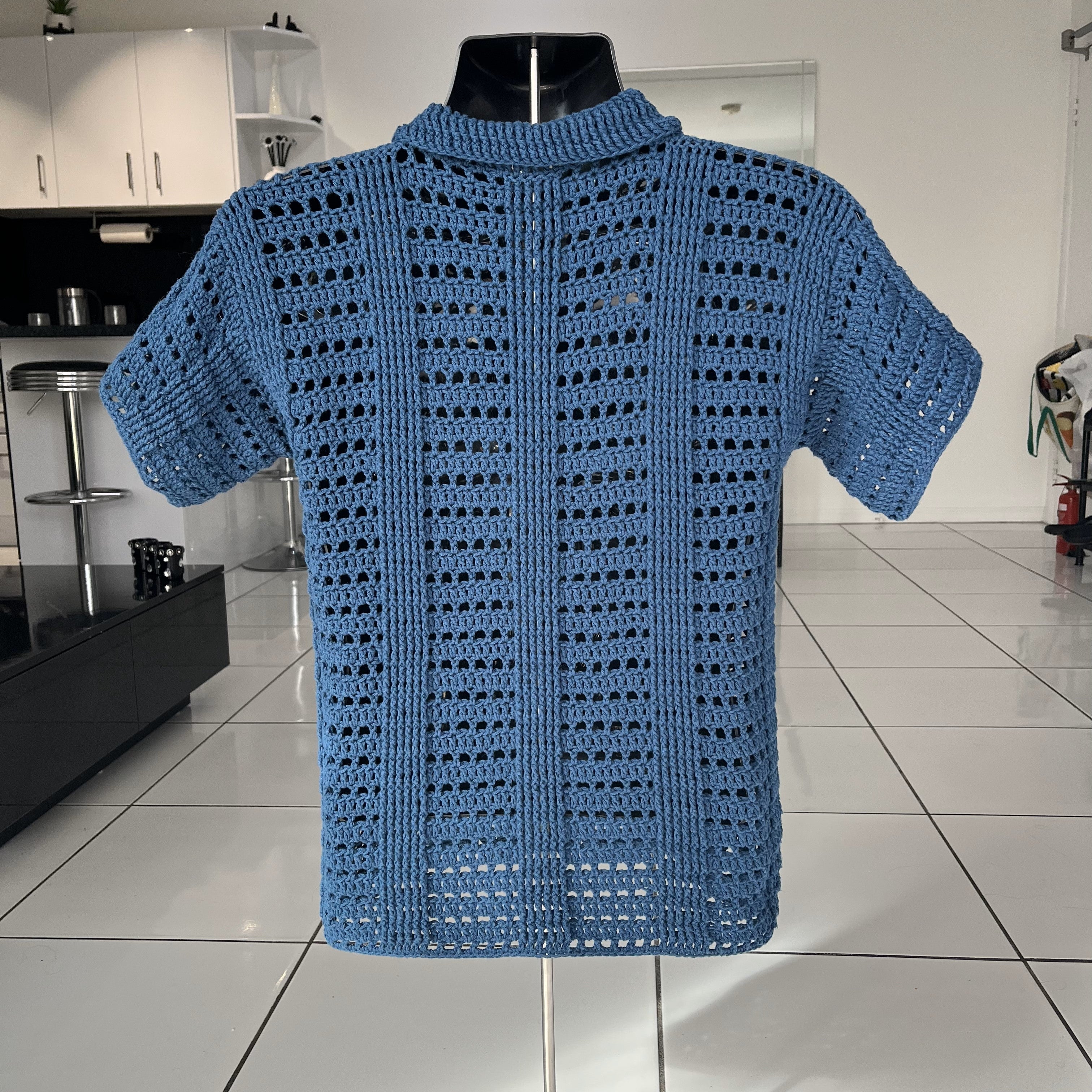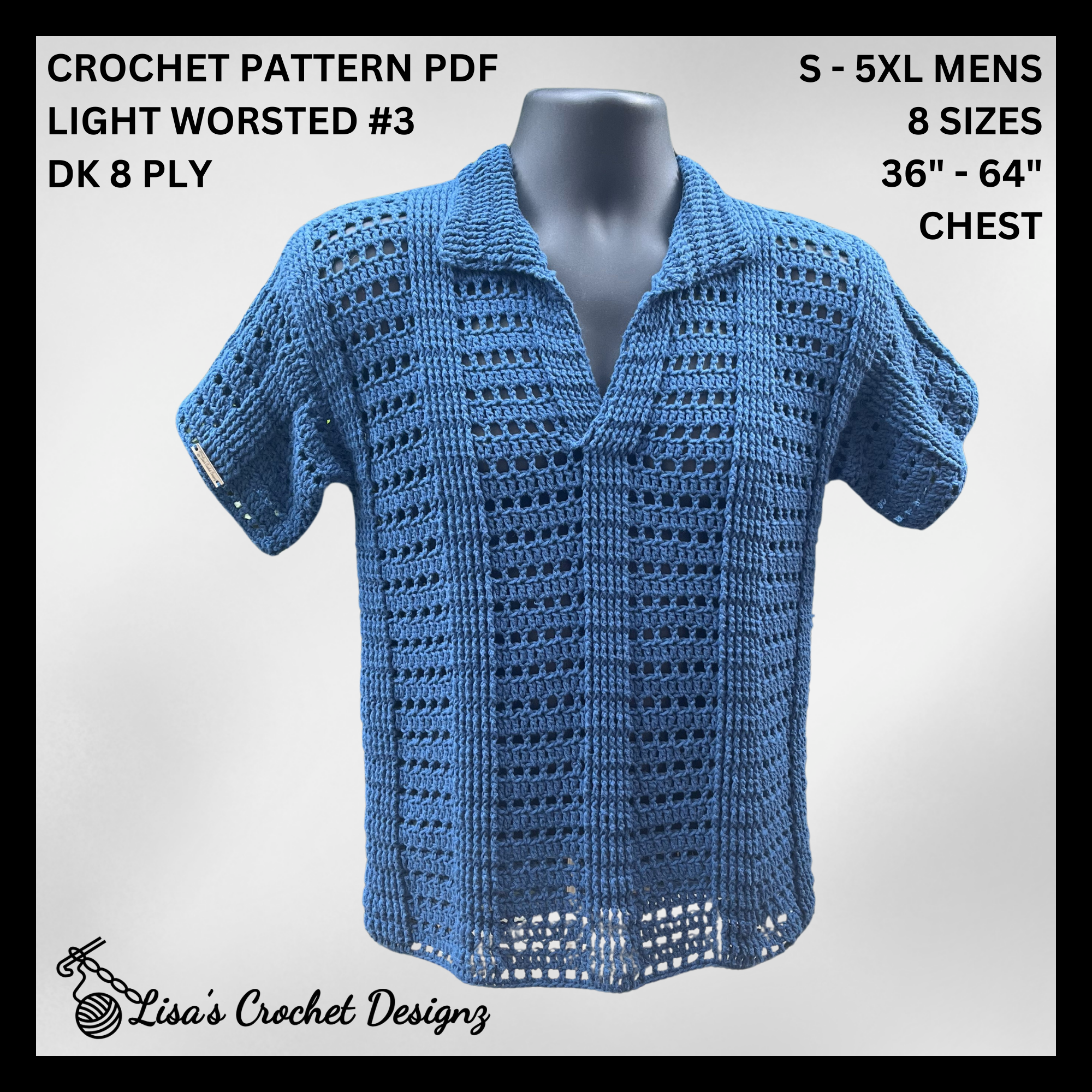 Craft your own stylish, breathable crochet polo shirt with this easy-to-follow pattern! This mesh collared top is perfect for warm weather and available in 8 sizes (S–5XL). The Ocean Polo Shirt | Unisex Crochet Mesh Shirt by Lisa's Crochet Designz is designed for both men and women.