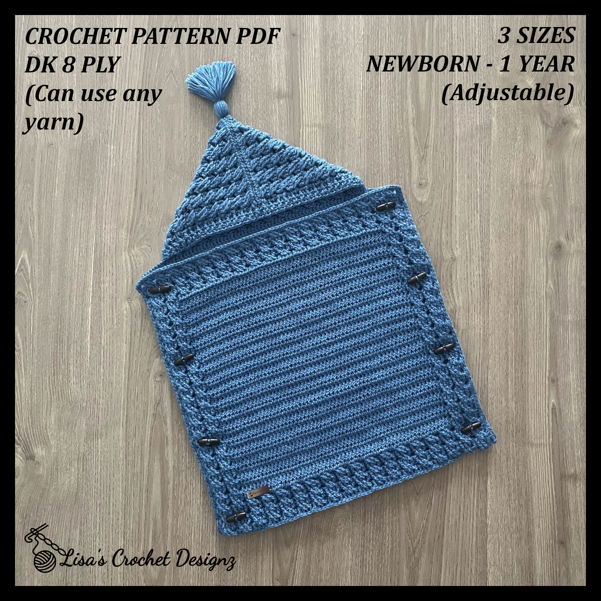 Create a warm, cozy handmade baby sleeping bag with the River Crochet Baby Sleeping Bag Pattern. This hooded, button-up cocoon design is perfect for pram outings and supervised naps, with a textured finish and practical front opening for easy access. The pattern includes three baby sizes up to 12 months with adjustable length for a custom fit.