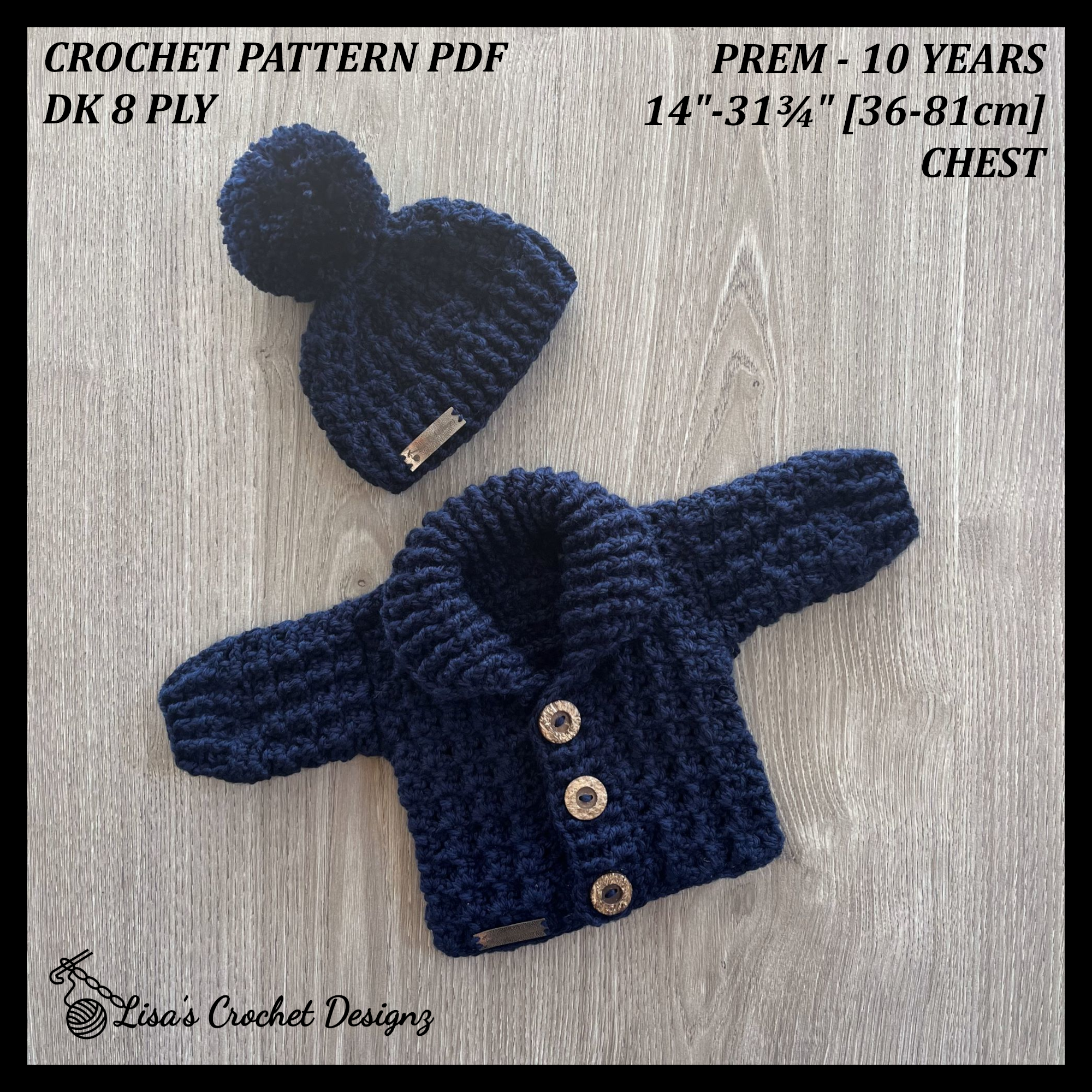 Create a classic shawl-collar crochet cardigan and matching hat set with the William Crochet Pattern. This timeless baby and kids design is perfect for everyday wear, special occasions, and thoughtful handmade gifts. The coordinated set makes it easy to create a complete outfit for growing babies and children.